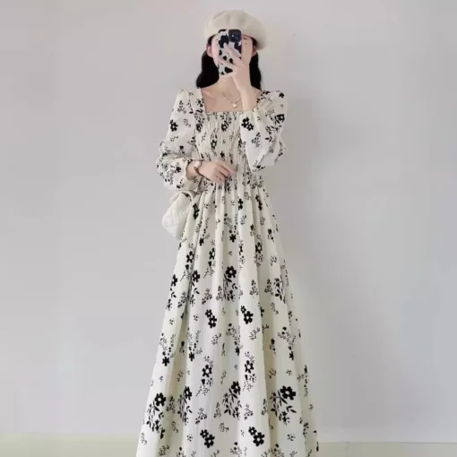 Hot Sale Of The Season New French Country Style Floral Dress Women’s Summer Square Collar Mid-Length Slimming Waist Sweet Skirt