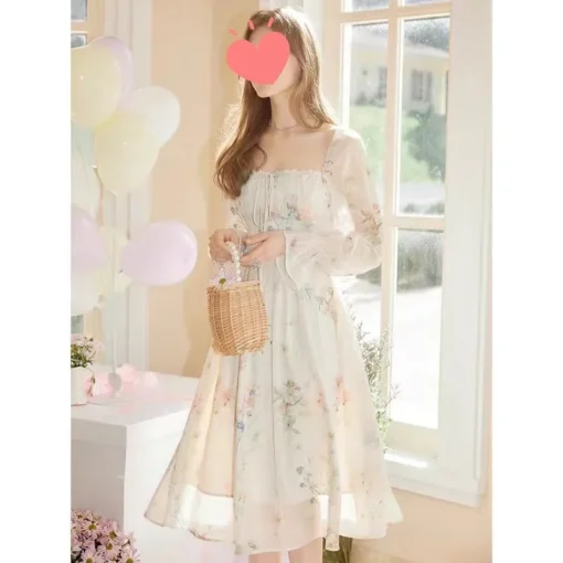Elegant Long Sleeve Waist-Fitted Medium-Length Women’s Dress French Style First Love Supernatural Sweet Thin Flowery Dress