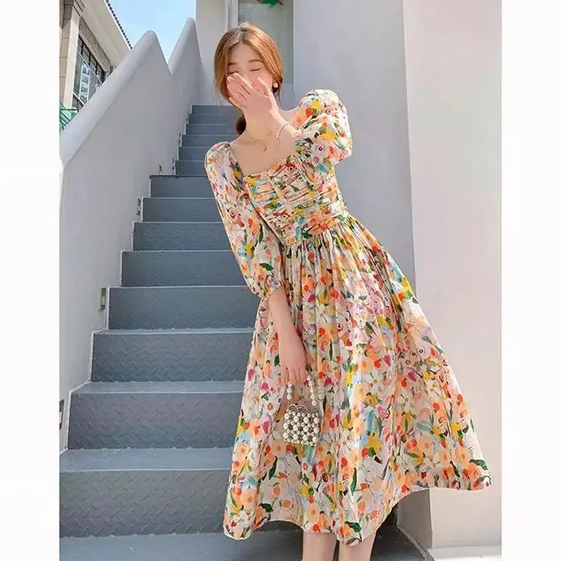 Elegant Vintage High-end Feel Square Collarpuff Sleeve Fragrant Dress For Women Stylish Beautiful Medium-length Summer Dress