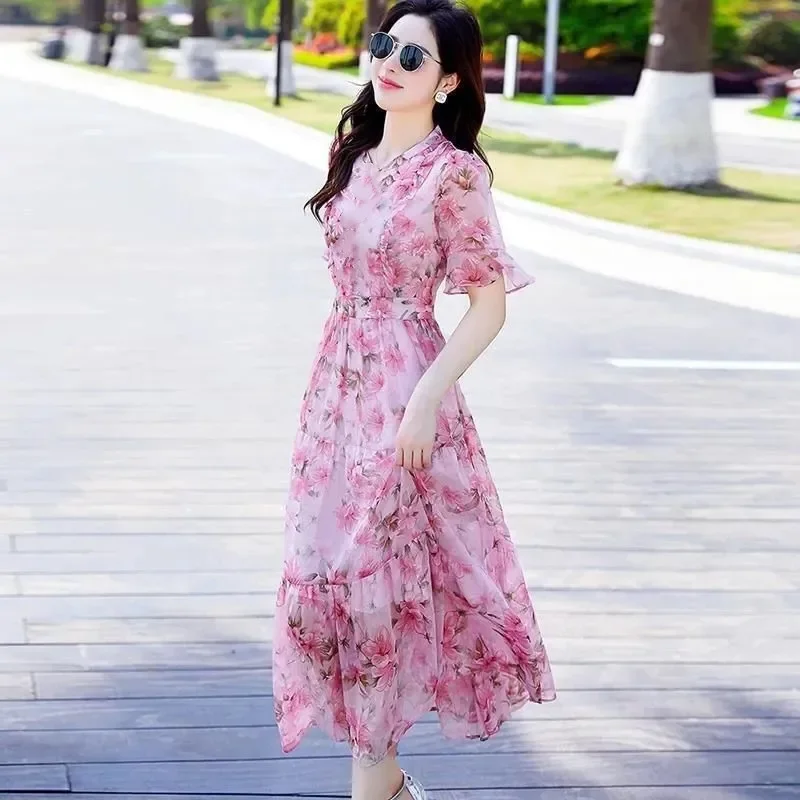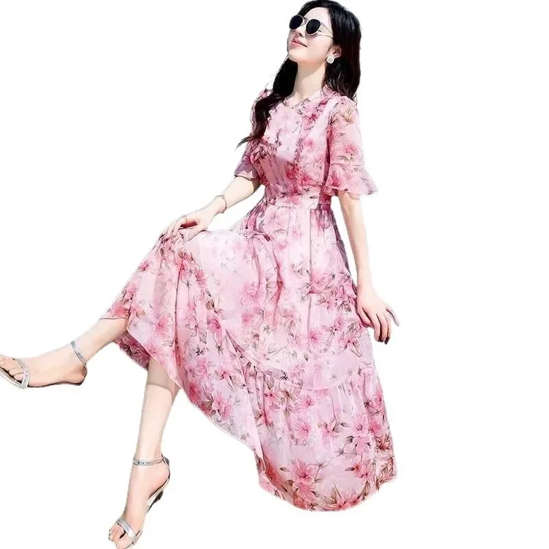 Summer New Print Midi Dress Chiffon Material High Waist Design Sensation Fairy Tale like Skirt Medium Length Elegant Style